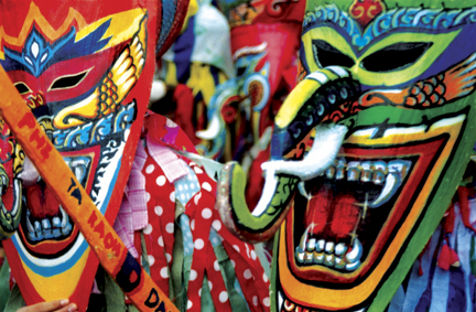 Dan Sai village, Loei Province, Thailand Phi Ta Khon, an annual festival held in the northeast, began with a somewhat structured parade of colorful, handmade masks and local beauty contest winners interspersed with pickup trucks blasting lively Thai music. However, the parade lines soon blurred as participants began mingling with bystanders, offering a dance or shot of whiskey, or just poking them with the phallic-like swords they carried. Rain-soaked and overwhelmed, I just wanted to fill my viewfinder with as much of the vibrant, crazy color that I could before those masks came off. LS |