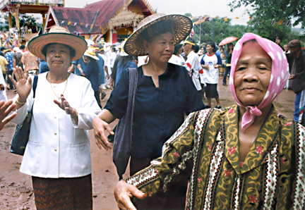 Dan Sai village, Loei Province, Thailand The festivities soon focused around the main temple, where the older villagers had already turned the slick, muddy ground into a hopping dance floor. They were quick to welcome us and our cameras. The women had a lovely, quiet way of dancing to the fast-paced music, stepping in place while delicately moving their hands to the melody. When I wasn't shooting them,I imitated their movements, much to their delight. LS |